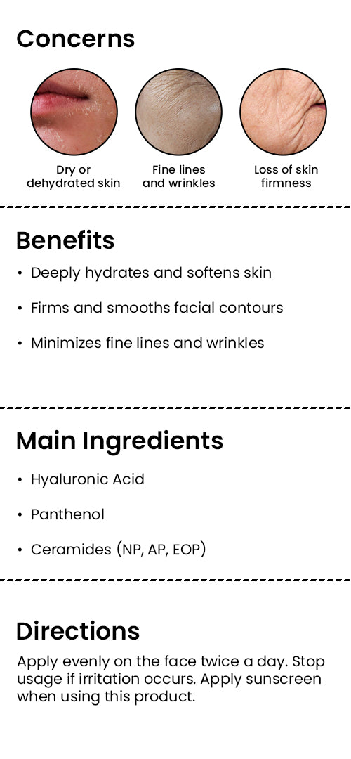 AQUA / WATER, GLYCERIN, CETEARYL ETHYLHEXANOATE, DIMETHICONE, AMMONIUM POLYACRYLOYLDIMETHYL TAURATE, SODIUM HYALURONATE, PANTHENOL, CERAMIDE NP, CERAMIDE AP, CERAMIDE EOP, CARBOMER, CETEARYL ALCOHOL, BEHENTRIMONIUM METHOSULFATE, SODIUM HYDROXIDE, SODIUM LAUROYL LACTYLATE, CHOLESTEROL, PHENOXYETHANOL, DISODIUM EDTA, ISOPROPYL MYRISTATE, CAPRYLYL GLYCOL, CITRIC ACID, XANTHAN GUM, PHYTOSPHINGOSINE, ETHYLHEXYLGLYCERIN